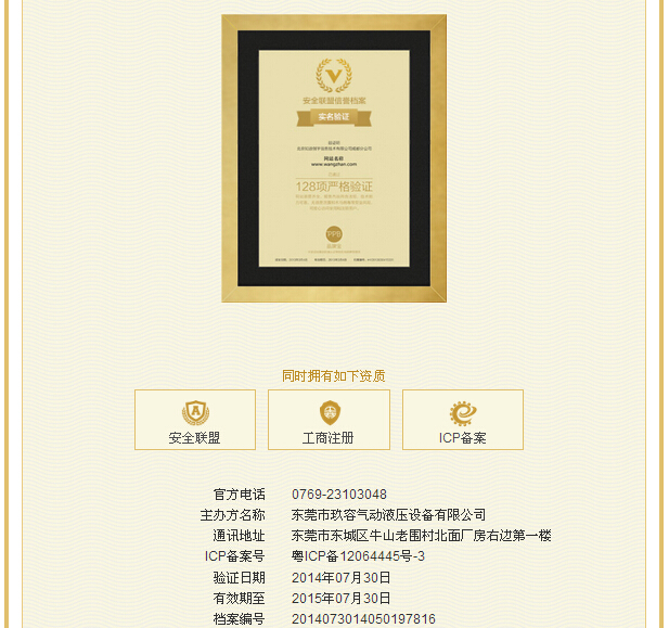 東莞市玖容氣動液壓設備有限公司獲得了安全聯盟認證