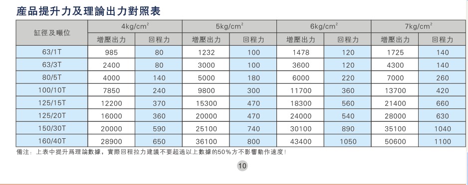 二 產品提升力及理論高壓出力對照表: